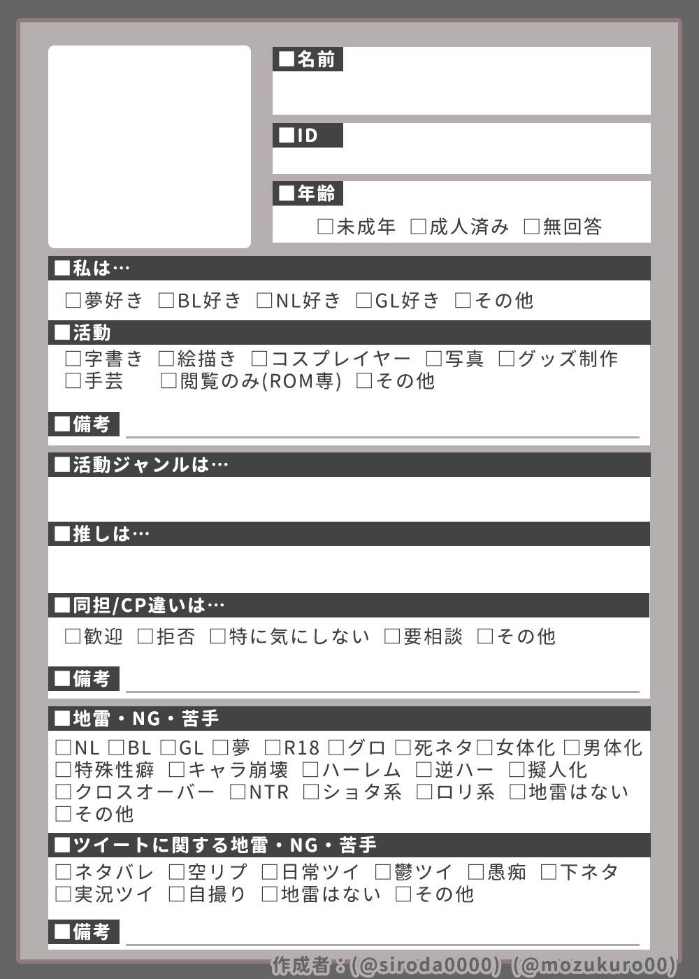 くろ テンプレート Twitter自己紹介シート 特定の趣味を持った人用のテンプレートです 地雷や当てはまるものにぺけぺけしていってください チェックボックスがほとんどだからものぐさな人でも安心 規約はリプツリーに テンプレート テンプレ
